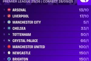 体育资讯09月29日讯 本轮英超,阿森纳2-1逆转绝杀纽卡斯尔联,赛后有关机构更新了英超冠军的赔率。